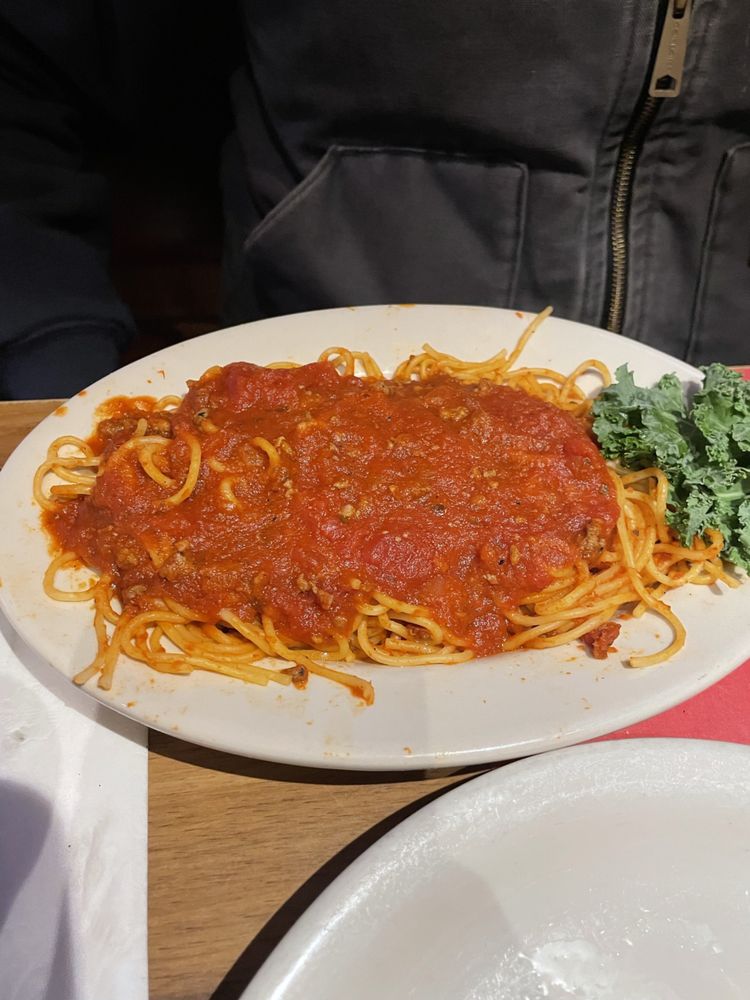 With meat sauce (rogala's own sauce). Choose a side: Cole-Slaw and Fresh Pasta, Salad, Soup, Vegetable